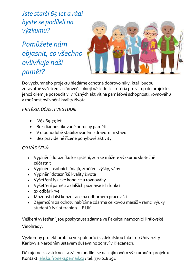 Úvod / O nás / Ocenění / V médiích / Osvětové přednášky / Studentské práce / Podpora projektů / Odkazy / Kontakt English Pro odborníky: Testy / Dotazníky / Vzdělávací kurz / Zobrazení mozku / Neuropsychologie / Neurochemie / Publikace Pro veřejnost: Vyšetření paměti / Ordinace v ČR / Info pro pečující / O Alzheimerově nemoci / Trénování paměti Zapojte se do našich výzkumů: Výzkum nových probiotik / Výzkum paměti a spánku / Cvičení a paměť / Spánková edukace